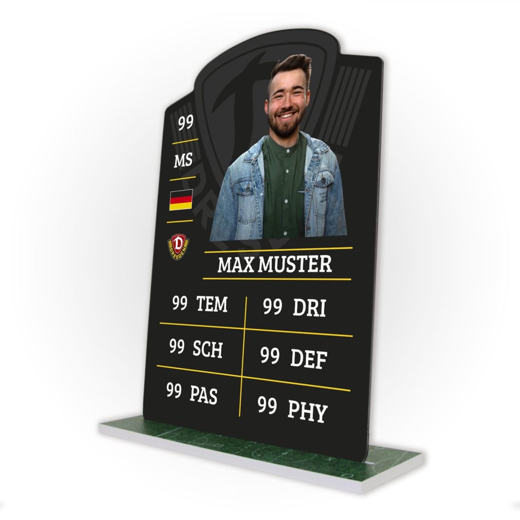 Die Dynamo Player Cards gibt es exklusiv nur bei uns. Du kannst sie nach deinen Vorstellungen ausfüllen. Gebe deine Spielerwerte ein, lade ein Foto hoch und trage deinen Namen ein. Wir drucken sie für dich und du erhältst einen einzigartigen Dynamo Dresden Fanartikel.